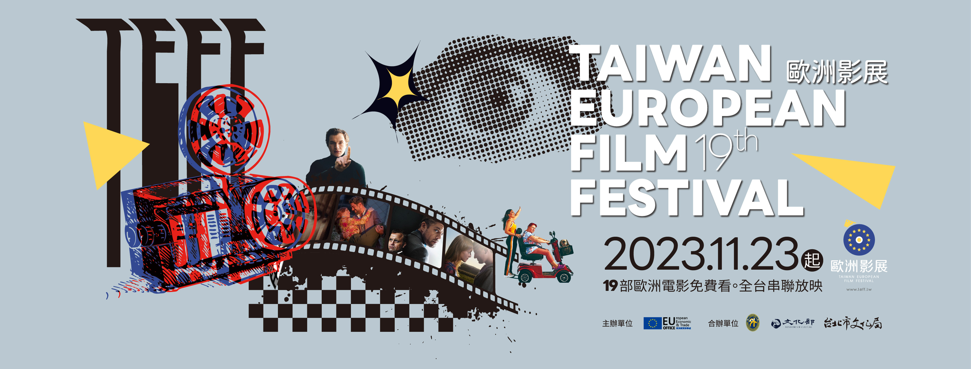 2023年第19 屆台灣歐洲影展由歐洲經貿辦事處以及大氣整合行銷共同舉辦,邀請19個歐洲國家個別推選出⼀部電影參展,於全台七個縣市,場地含蓋藝⽂空間、表演空間、戲院等放映,本校精選11部電影,將於2023年11⽉20⽇⾄2023年12⽉19⽇期間放映。