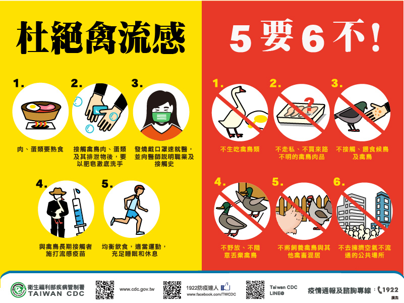 | (二)提醒前往中國大陸流行地區旅遊、學術交流之教職員工生,務必落實良好衛生習慣,避免接觸及飼餵禽鳥與出入活禽市場,且勿撿拾禽鳥屍體;食用雞、鴨、鵝及蛋類要熟食,以降低感染風險,並特別注意下列事項: |
