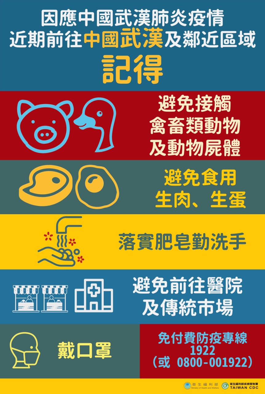 記得避免接觸禽畜類動物及動物屍體、避免食用生肉生蛋、落實肥皂勤洗手、避免前往醫院及傳統市場、空氣不流通或人潮擁擠之場所、咳嗽戴口罩.返國14日內身體不適戴口罩盡速就醫