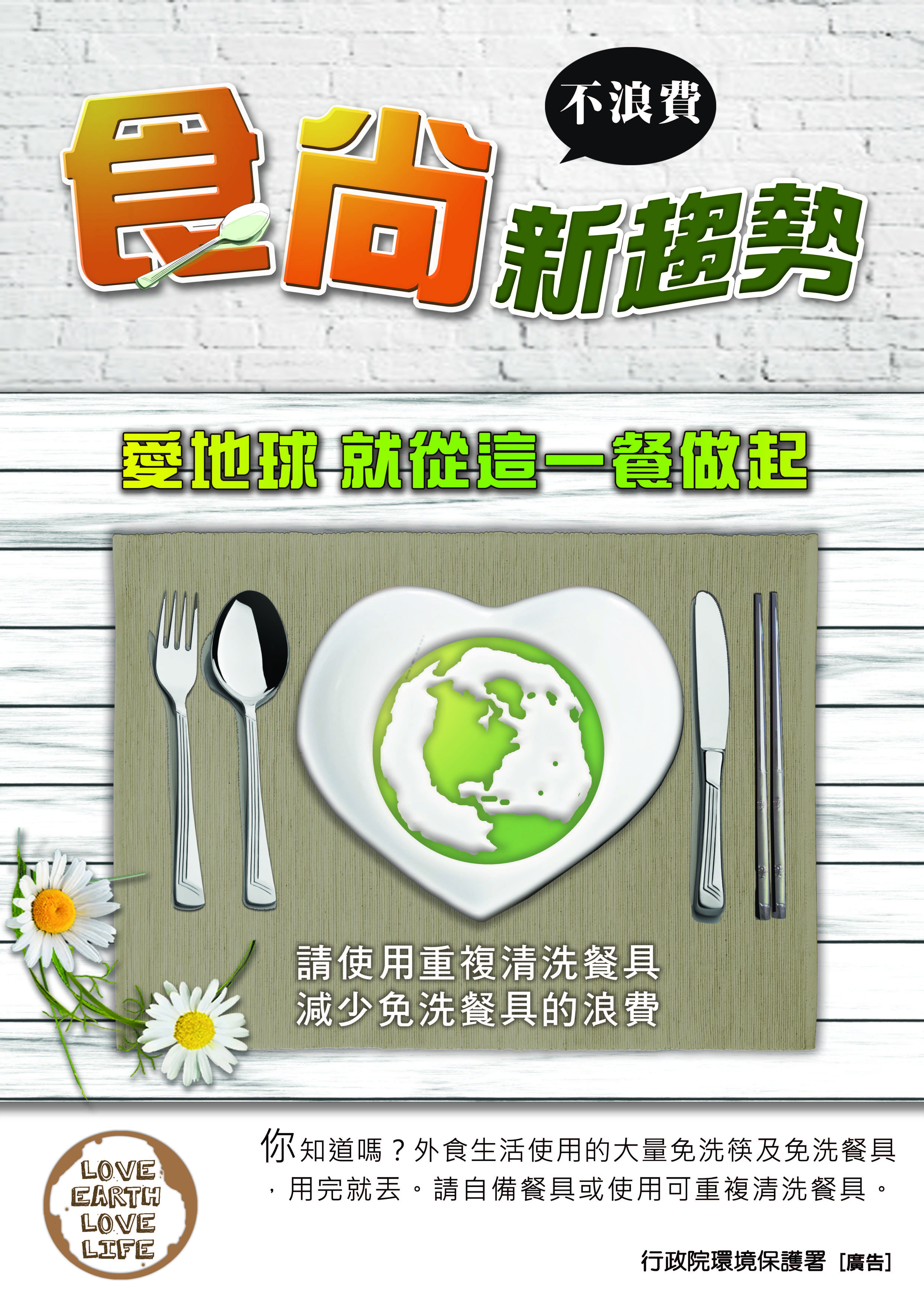 函轉行政院環境保護署設計之3款一次用產品減量宣傳海報檔案,歡迎索取宣傳。「自備餐具」