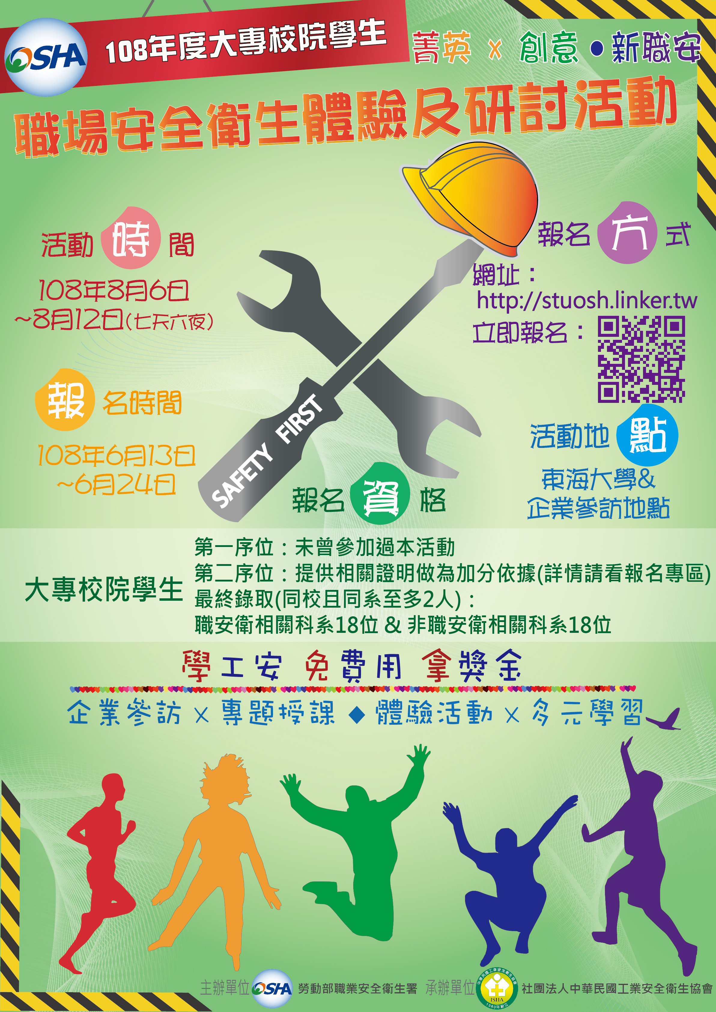 二、本活動全程免費,惟活動場地及人數限制,原則將以職業安全衛生、勞工及理工等相關科系學生為優先,預定於108年6月13日開放網路報名,請有意願報名人員至(http://stuosh.linker.tw/)網站報名,本署將依報名辦法遴選出36名學員參加,並備取若干名,請參訓學員全程參加。