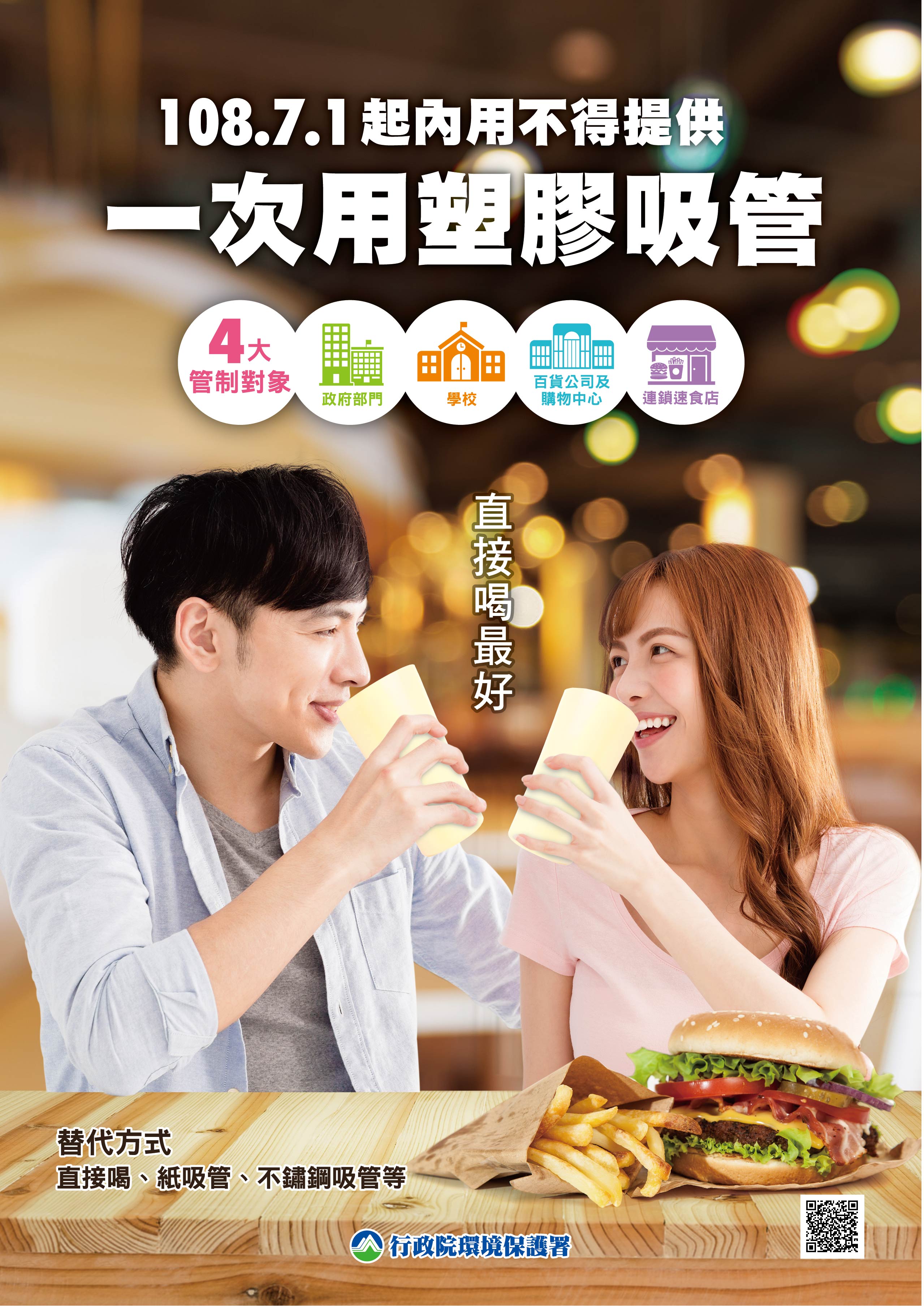 公布「一次用塑膠吸管限制使用對象及實施方式」,自108年7月1日起校內內用將不提供一次用塑膠吸管