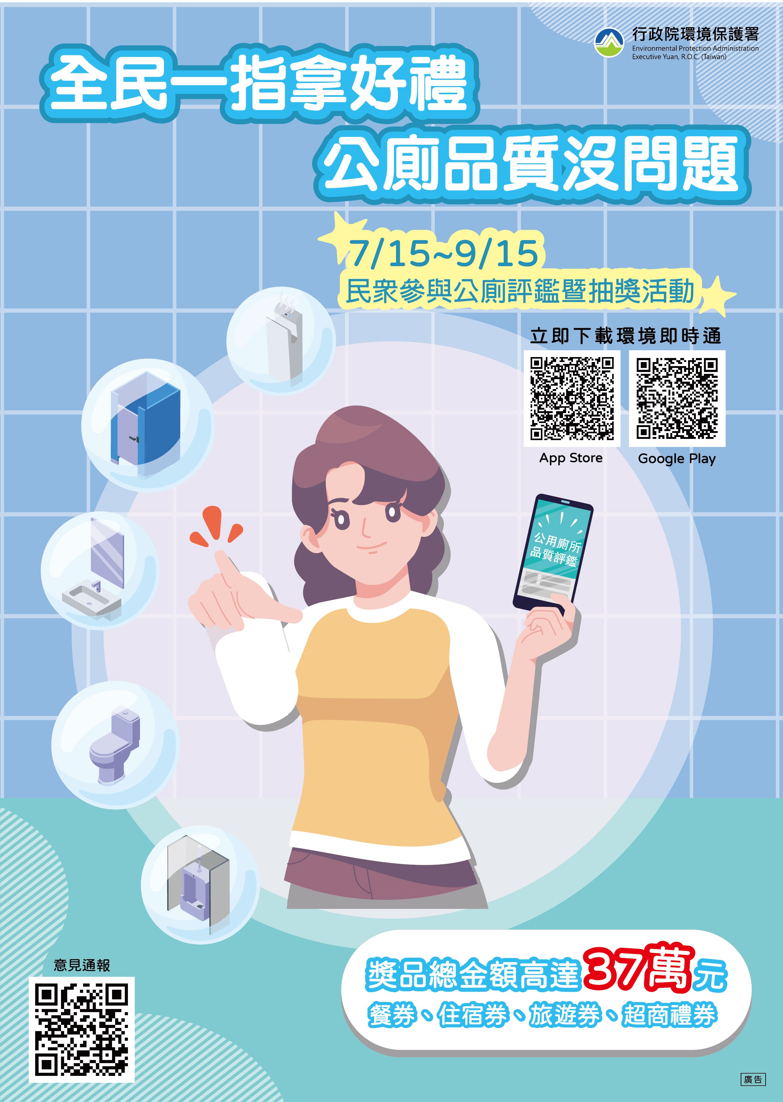 一、依行政院環境保護署112年7月18日環署督字第1121085348號函辦理。 二、為提升公廁環境潔淨品質,該署辦理旨揭活動,鼓勵民眾使用公廁後踴躍為公廁評鑑並回饋使用感受,民眾評鑑結果於活動後將予以公布。活動資訊摘要如下: (一)活動期程:112年7月15日至同年9月15日。 (二)評鑑對象:全國列管公廁。 (三)評鑑方式:參與民眾請至公廁體驗,掃描環保機關列管公廁專屬QR Code 跳轉至公廁評鑑系統,對該座公廁進行評鑑,但同一座公廁每人每天僅能評鑑1次。評鑑時手機定位需在公廁周邊100公尺內(如超出100公尺仍可以評鑑,但無法獲得抽獎機會)。 三、隨文檢附活動辦法、活動海報各1份。相關資訊並同步置於該署「清淨家園故厝邊綠色生活網」(https://ecolife.epa.gov.tw/)「檔案下載」專區,請自行下載參考。倘有相關問題,請逕洽承辦人賴先生,聯絡電話:(04)2252-1718分機53686,或承辦單位台灣產業服務基金會龔先生,聯絡電話(02)7704-5112。依行政院環境保護署112年7月18日環署督字第1121085348號函辦理。
