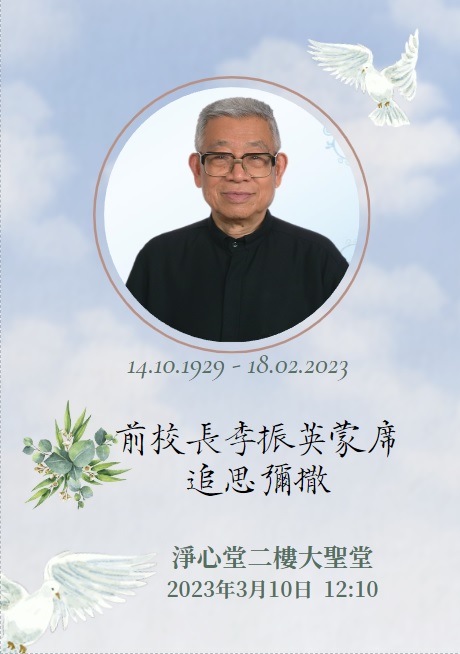 本校全體師生對前校長李振英蒙席的逝世深感不捨,將於3月10日(五)中午12時於淨心堂舉辦追思彌撒,