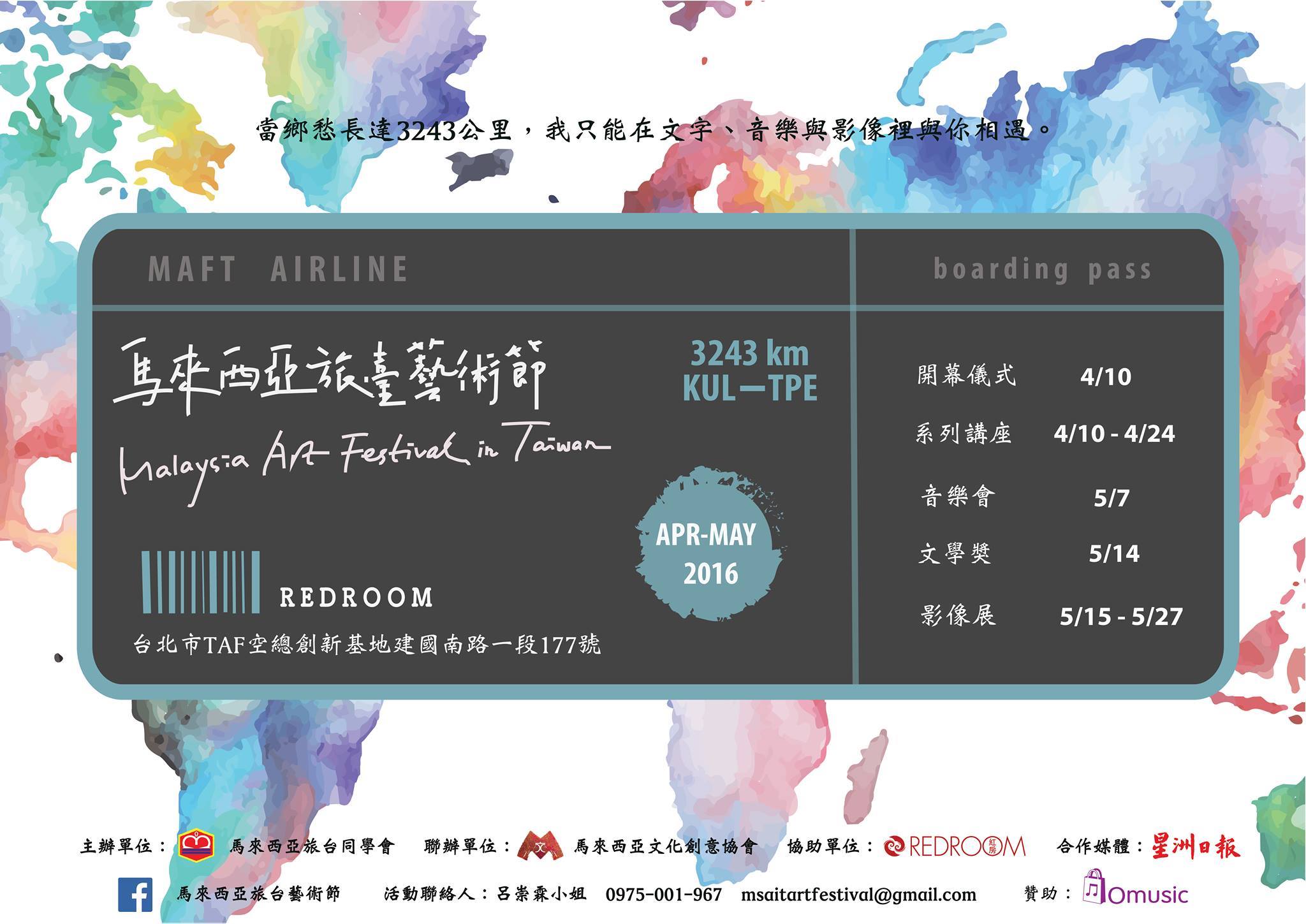 一、 為發掘音樂、文學及攝影三大領域的大馬旅台學子,並與台灣本地學生進行藝術交流,推廣馬來西亞旅台藝術家的作品,馬來西亞旅臺同學會將於105年4月至5月期間舉辦「第二 屆馬來西亞旅台藝術節」。