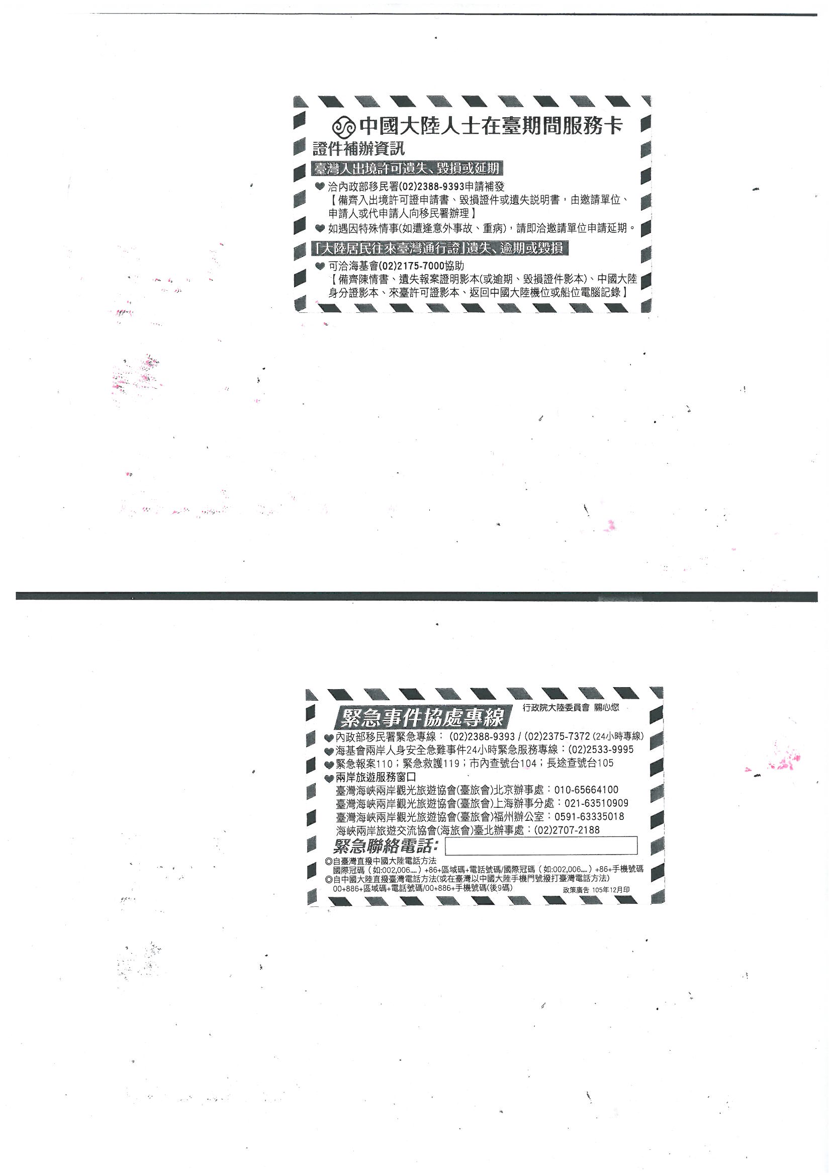 由行政院大陸委員會印製「中國大陸人士在臺期間服務卡」,掃描檔案如附件,提供大家參考運用!
