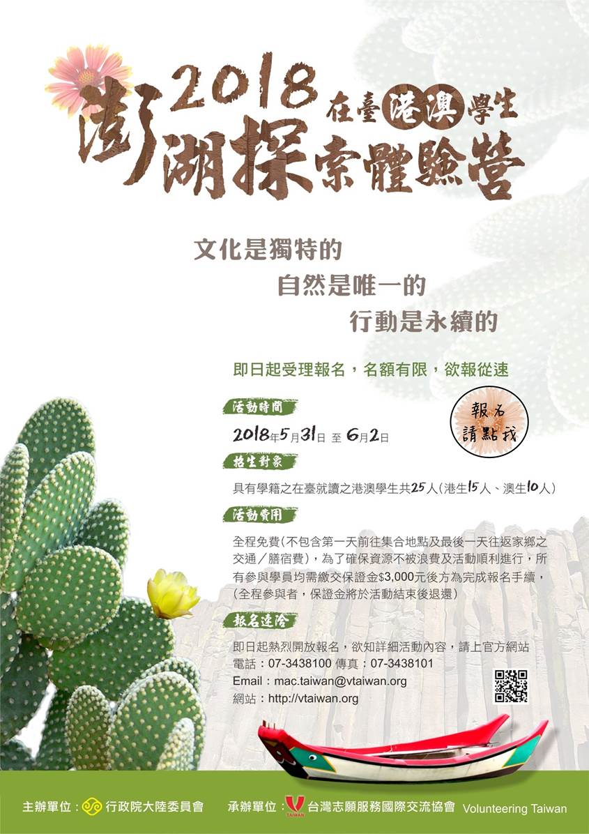 由行政院大陸委員會主辦「2018在臺港澳學生澎湖探索體驗營」將於5月31日至6月2日(週四-週六)舉行,若學員遇星期四、五有課,本機構將行公文至校惠請准予公假參加。