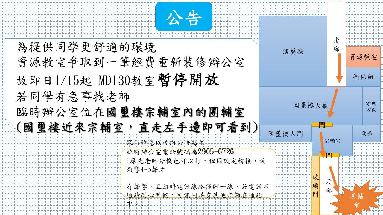 可至國璽樓1樓宗輔室內的團輔室找老師