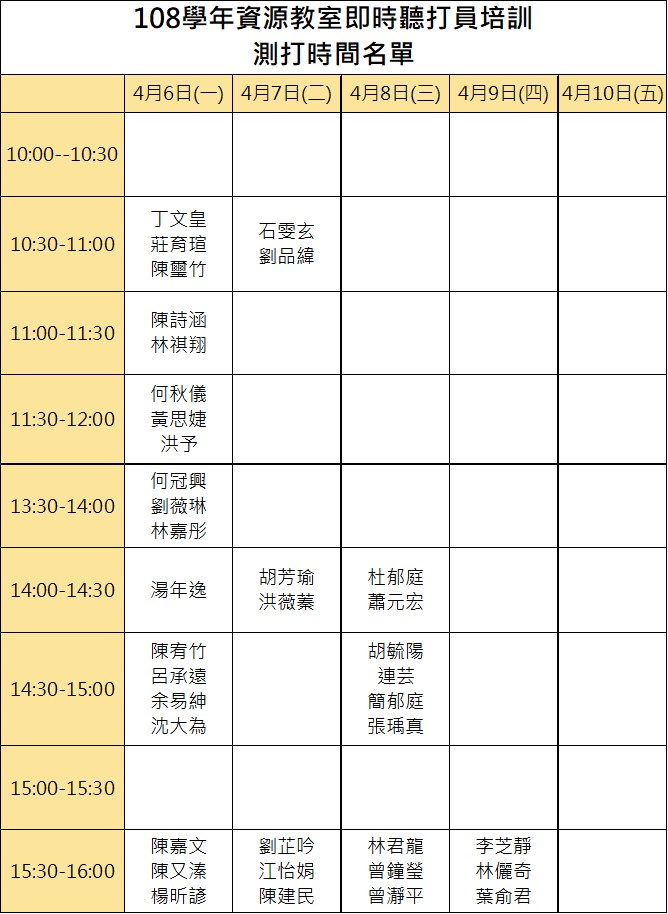(五)測打通過,可進入培訓課程之錄取名單將於4/10(五)公告於資源教室網頁。請錄取同學務必準時參與培訓課程。