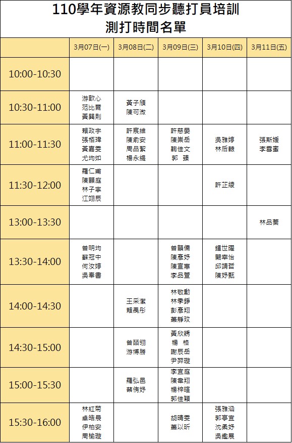 (一)測打時間共計約30分鐘,請提早10分鐘至資源教室辦理報到,測打當日未到者,視同放棄機會。