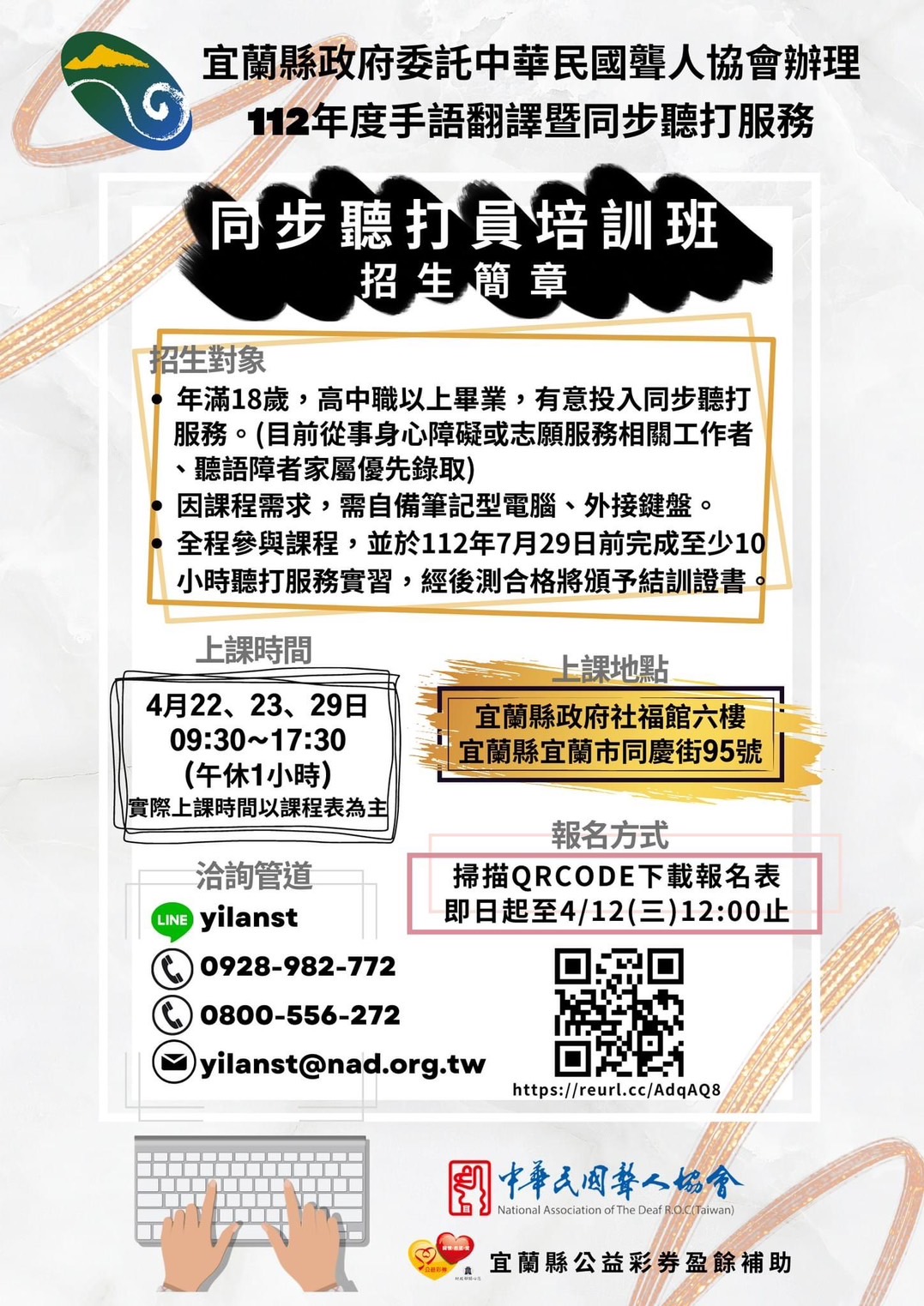 培訓對象資格:年滿18歲,高中(職)以上學歷,具基本文書與電腦能力,中文聽打速度達60字/分鐘(不限輸入法),需自備筆電、耳機及外接鍵盤,歡迎對服務聽覺障礙者有熱忱者報名參與,預計培訓30人。