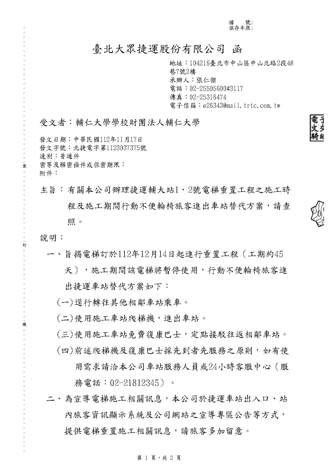 捷運輔大站1、2號電梯重置工程施工期間行動不便輪椅旅客進出車站替代方案