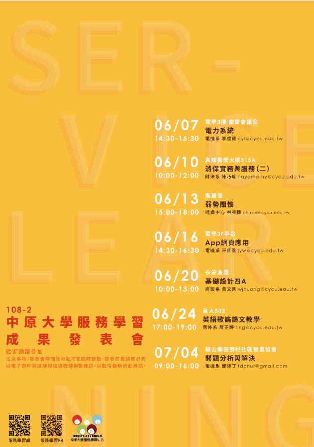 中原大學「108-2學期服務學習課程成果發表會」歡迎教職員生參加
